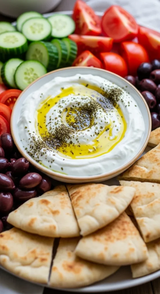 2. Place cucumbers, tomatoes, olives, and pita around it.