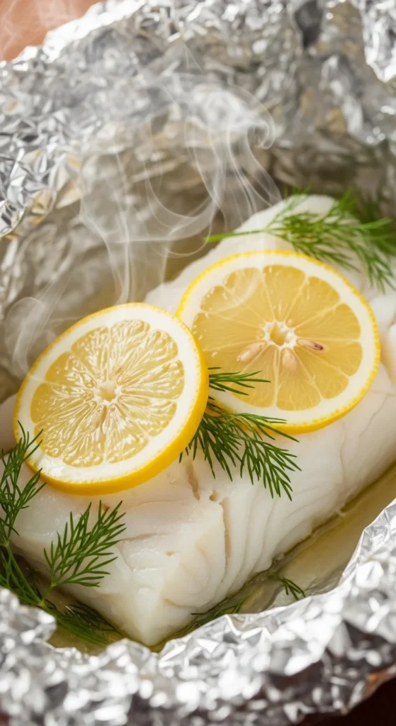 - Add cod to foil, drizzle oil, season, and top with lemon.