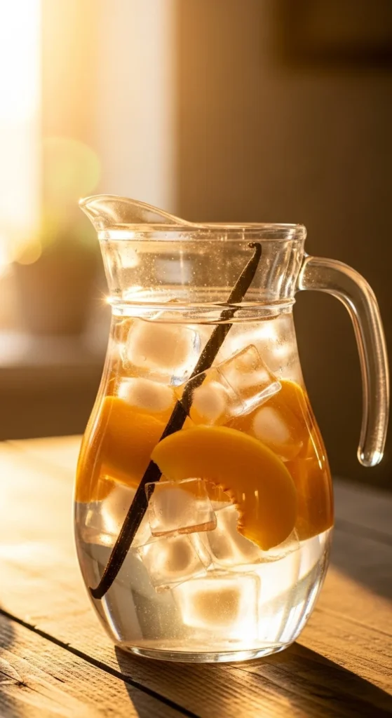 - Add peach slices and vanilla bean (or extract) to the pitcher.