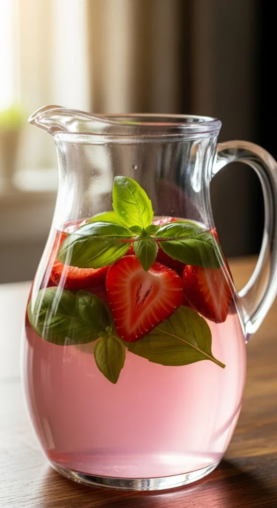 Top each glass with a sliced strawberry on the rim and a tiny basil leaf.