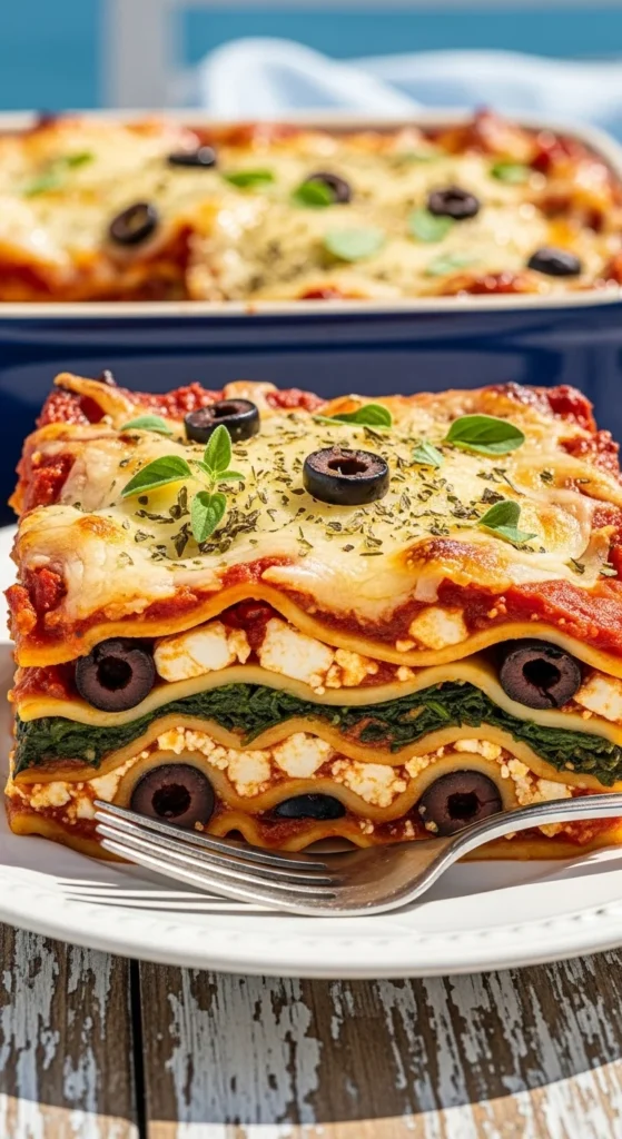 Spinach, feta, and olives bring Greek flavors to this layered pasta bake.