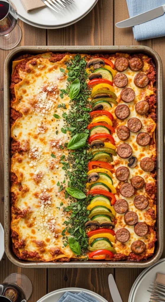 This lasagne pan uses one base but varies the toppings across sections, perfect for feeding guests with different preferences.