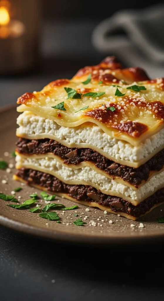 Deeply cooked mushrooms and sweet onions create a cozy vegetarian lasagne with rich flavor.