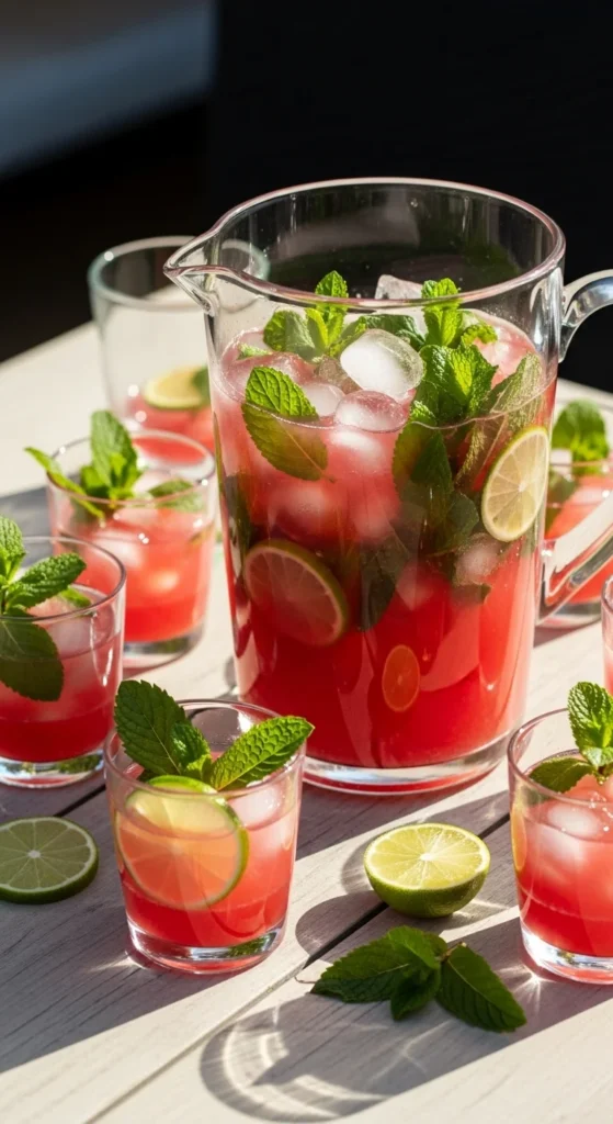 - In a pitcher, combine watermelon juice, lime juice, simple syrup, and mint leaves.