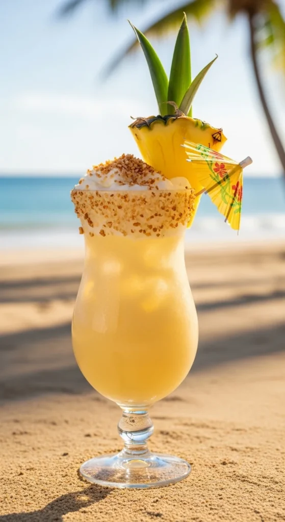 Top with toasted coconut flakes and garnish with a pineapple wedge.