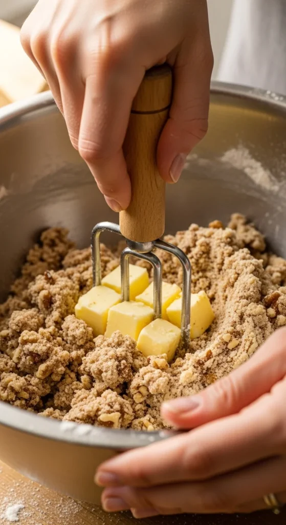 Add the cold, cubed butter to the flour and nut mixture. Use a pastry cutter, two forks, or your fingertips to work the butter into the mixture until it resembles coarse crumbs. Tiny bits of butter should still be visible—they’re what create the flaky texture after baking.