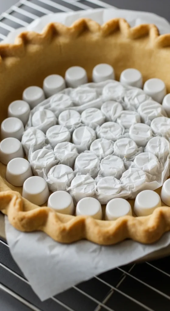 - Line the crust with parchment paper and fill with pie weights or dried beans