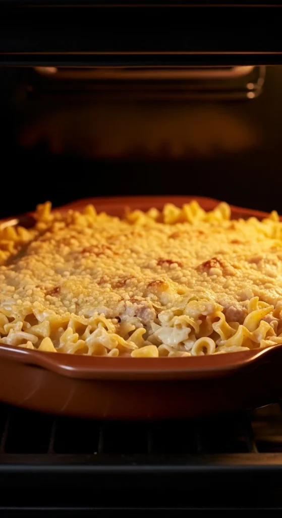 Simmer noodles in sauce. Bake 375°F for 10 min.