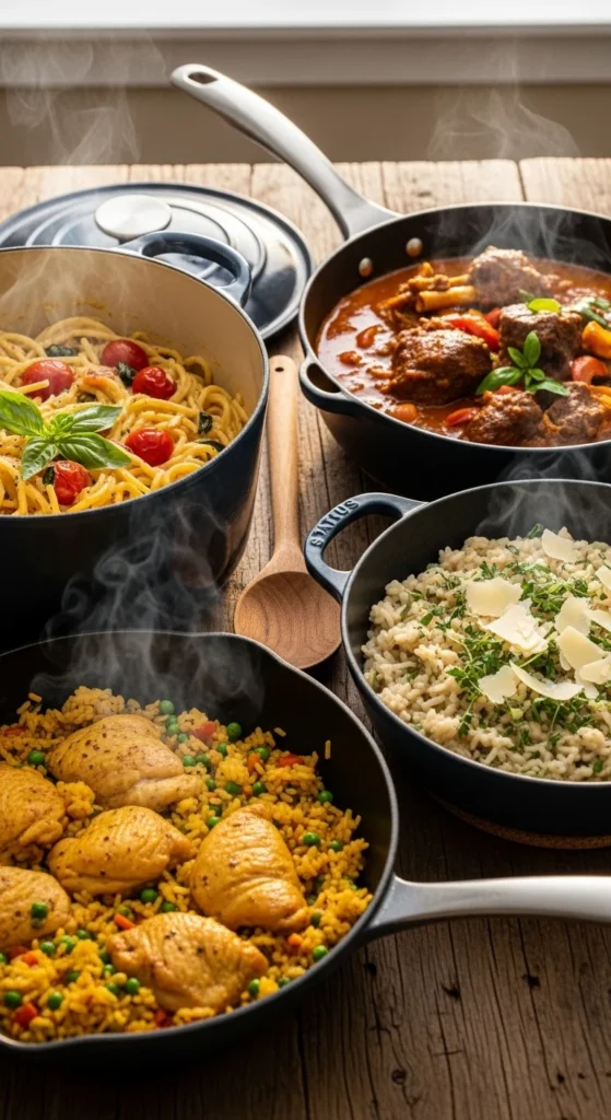 If weeknights feel rushed and the sink fills up fast, one-pot dinners are a lifesaver. Everything cooks in a single pan or pot, which means less cleanup and more time to relax. These recipes focus on creamy pastas, hearty chicken rice, cozy stews, and quick global flavors the whole family will happily eat.