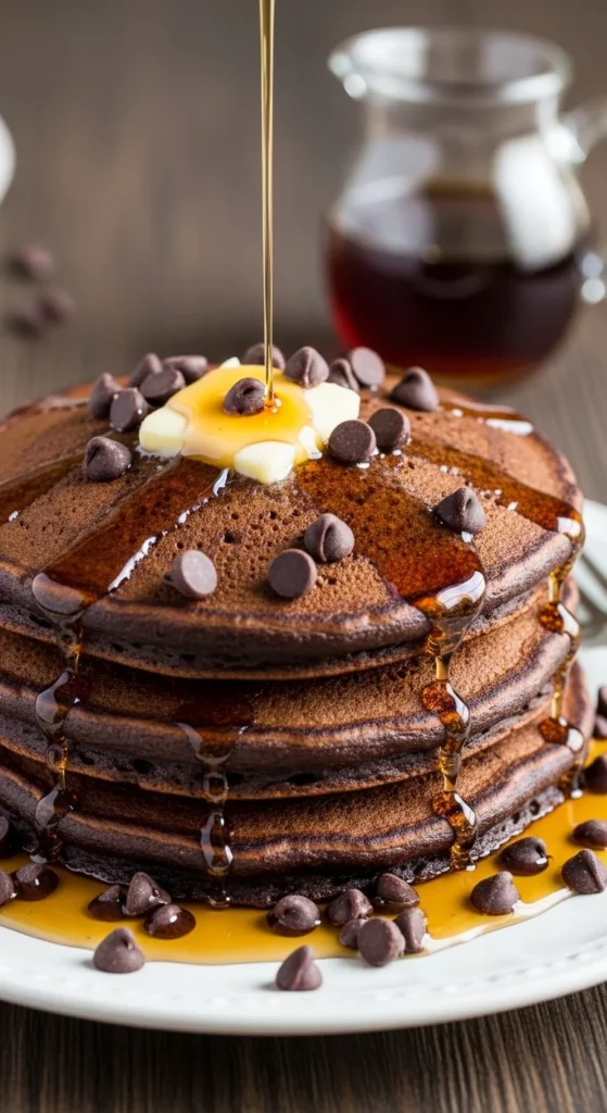 Chocolate pumpkin pancakes combine cocoa flavor with warm pumpkin spice.