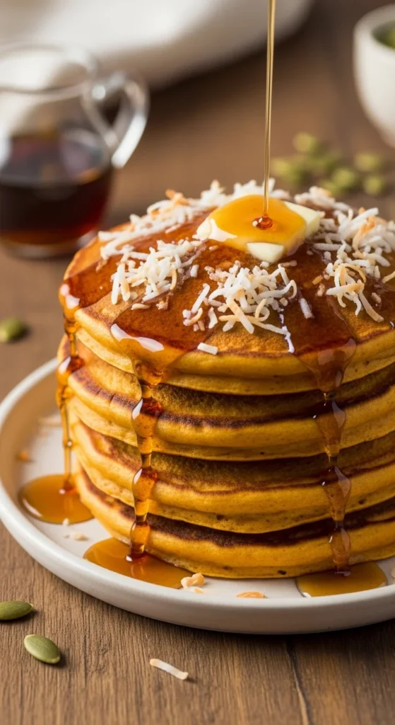 Coconut adds tropical flavor to classic pumpkin pancakes.