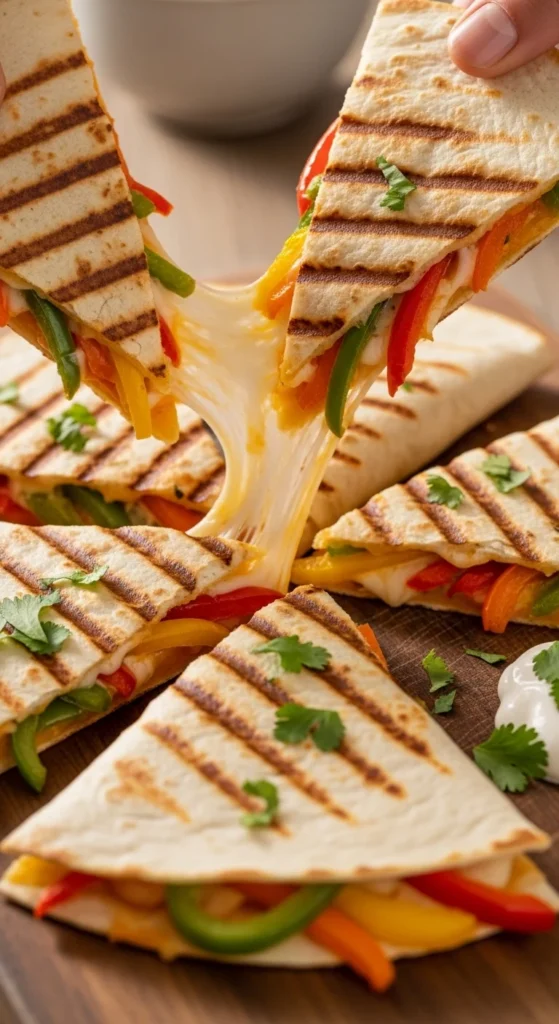 Cook veggies, fill tortillas, grill 3 minutes per side.