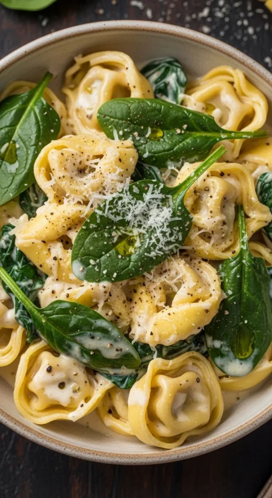 Boil pasta, stir in cream and spinach, simmer 3 minutes.