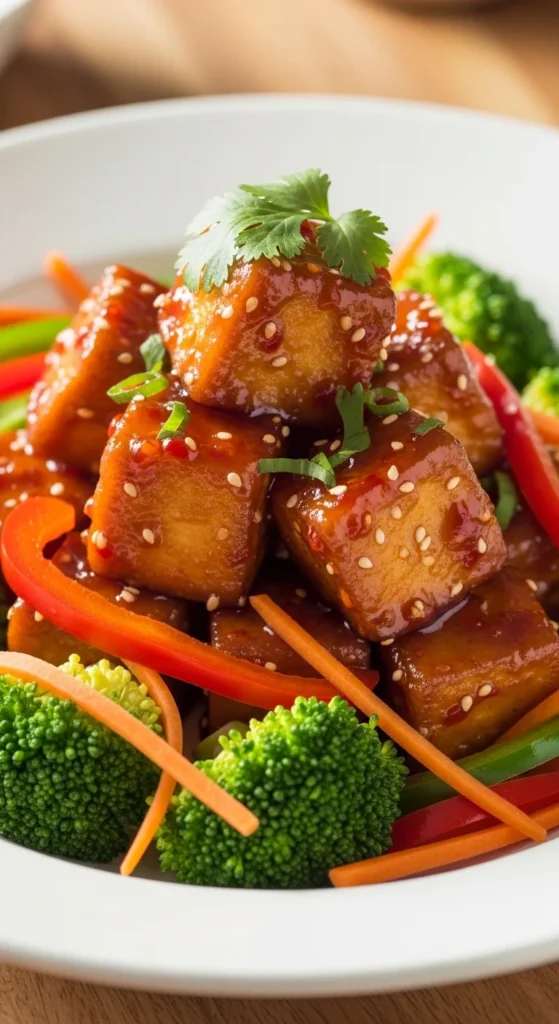 Brown tofu, add veggies and sauce, cook 5 minutes.
