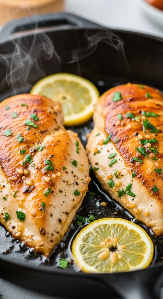 Tender chicken coated in buttery garlic sauce cooks in one pan for fast cleanup.