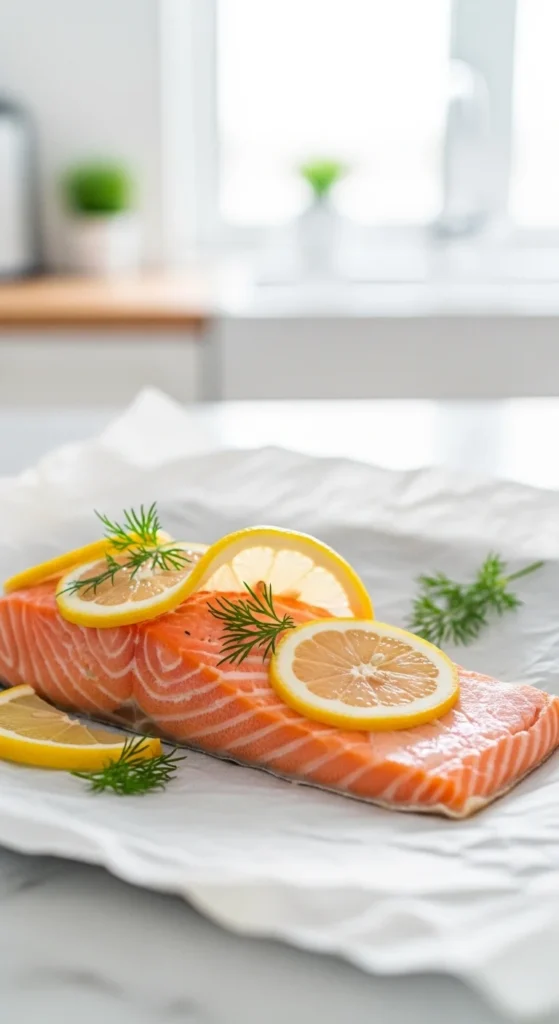 - Season salmon and add lemon.