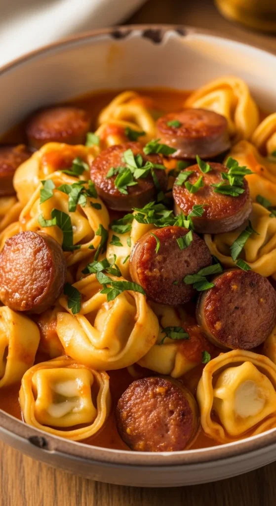 Cook sausage. Add tortellini and cream. Simmer 6–8 min.