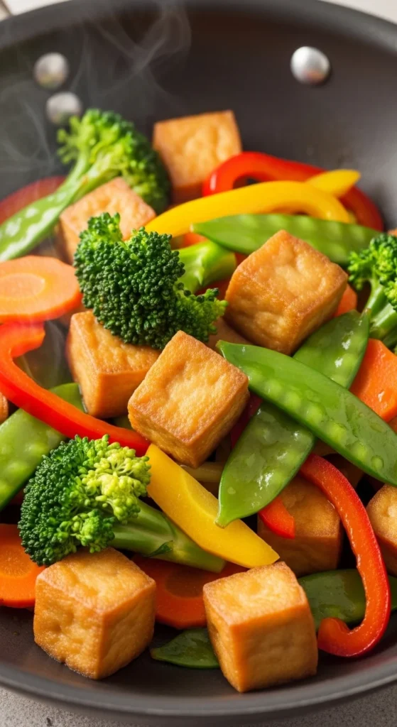 Stir-fry tofu 5 min. Add veggies and sauce, cook 4 min.