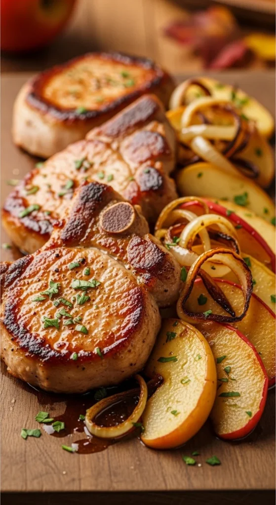Sear chops 4 min per side. Add apples/onions and cook 5 min.