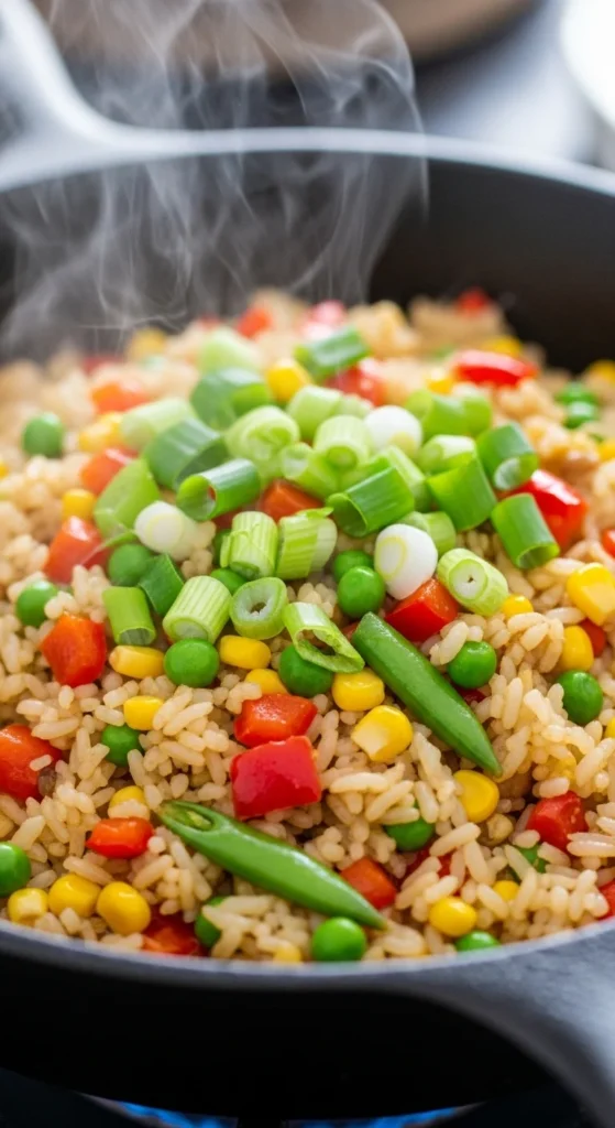 Cook veggies in butter. Add rice and eggs. Stir-fry 5–6 min. Add soy.