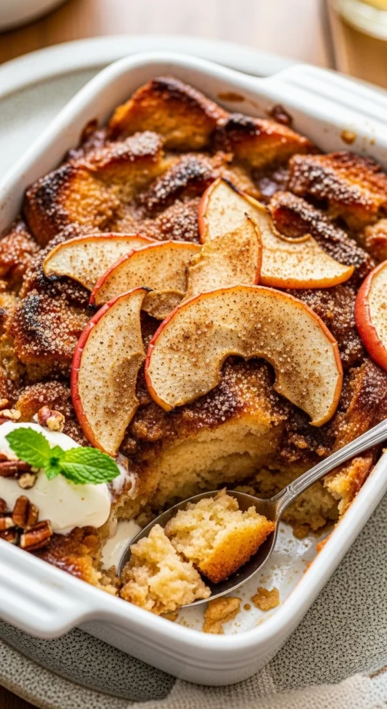 Soft bread soaked in custard and baked with apples — a fall classic.
