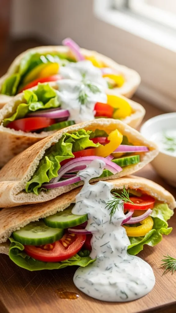 - Fill pita with vegetables and drizzle sauce.