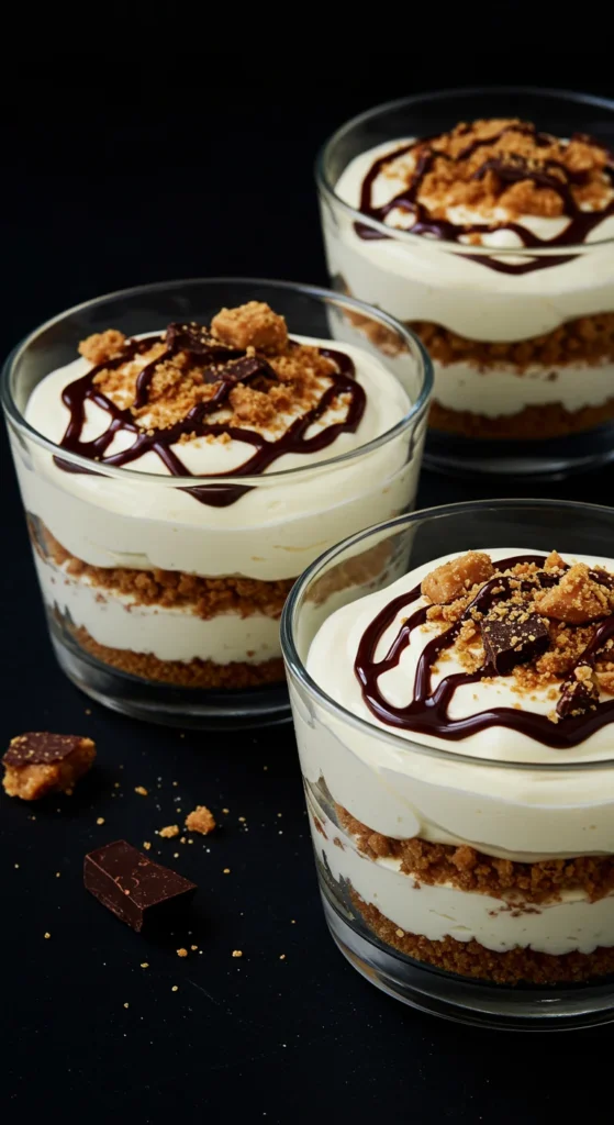 - Layer cookie crumbs, cheesecake mixture, and toffee in glasses.
