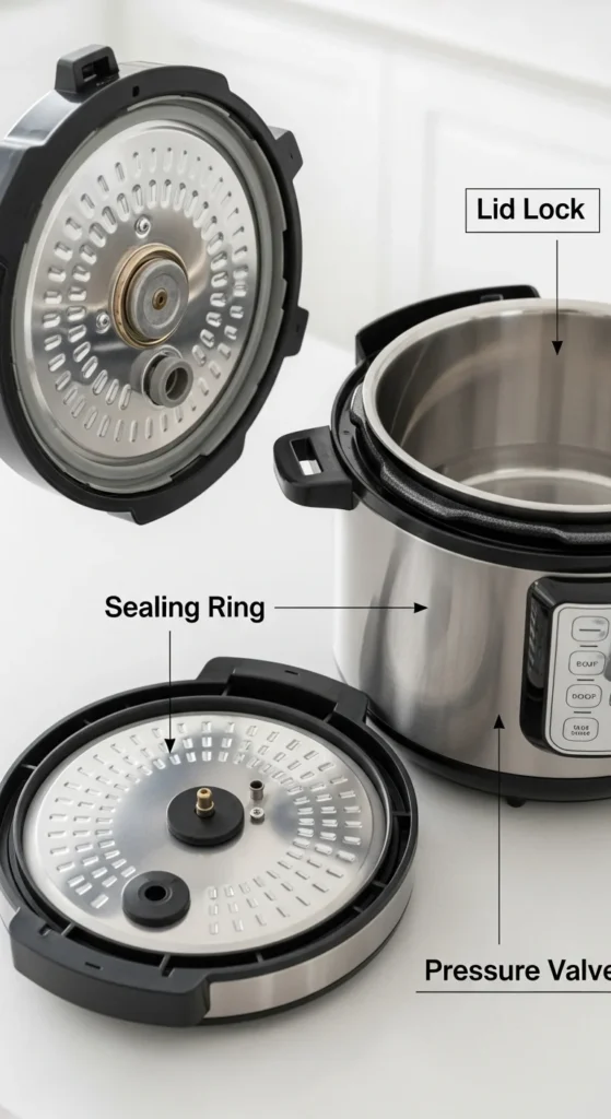 Never force open the lid until all pressure has been released. Check that the safety pin or float valve has dropped — it’s your signal that it’s safe to open.