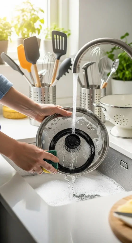 - Wash the lid, sealing ring, and pot thoroughly with warm soapy water.