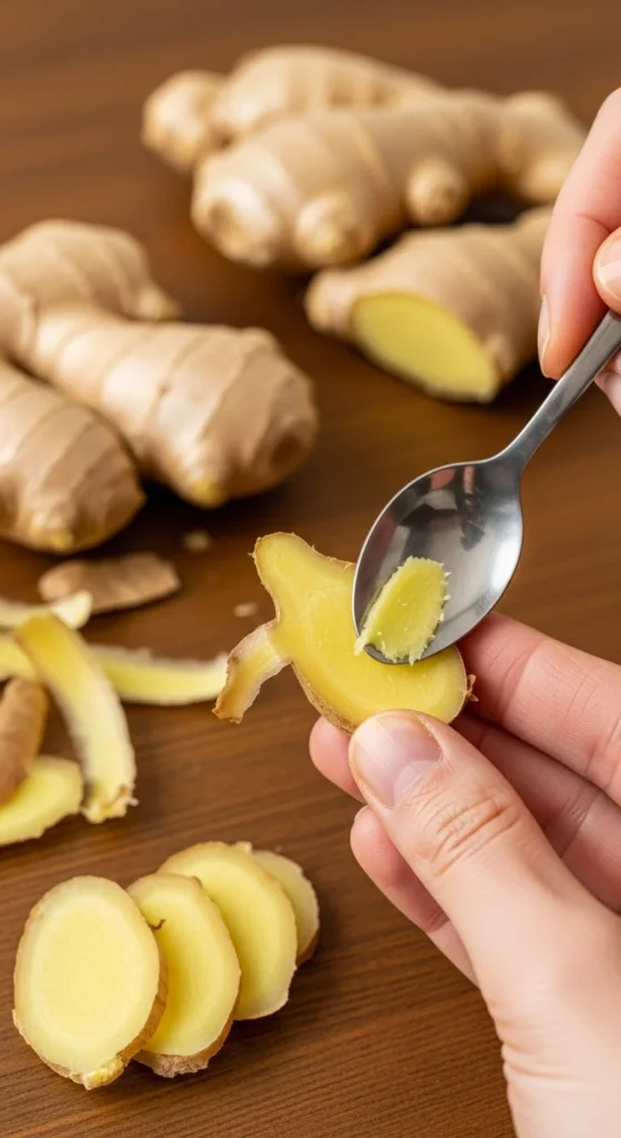You don’t need to peel ginger if it’s young and tender, but if the skin feels thick, peel it with a spoon (not a knife). The spoon’s edge easily scrapes away the thin skin without wasting the flesh.