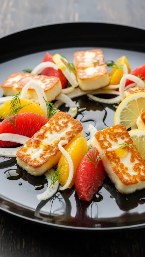 Pan-seared halloumi adds warm, salty bites that pair beautifully with bright citrus.