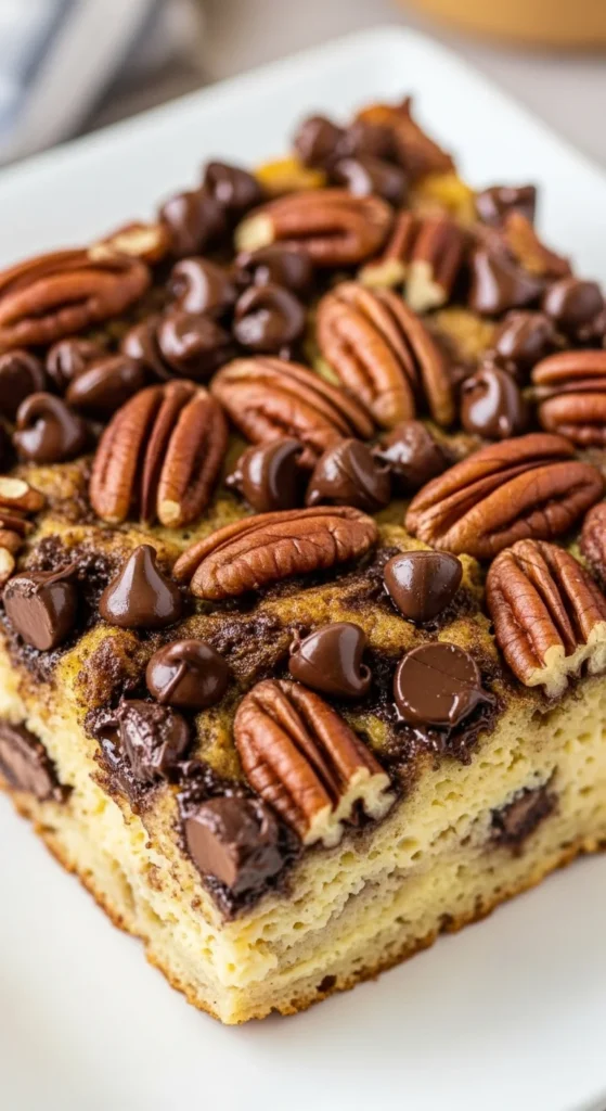 - Sprinkle chocolate chips and pecans evenly over the bread.