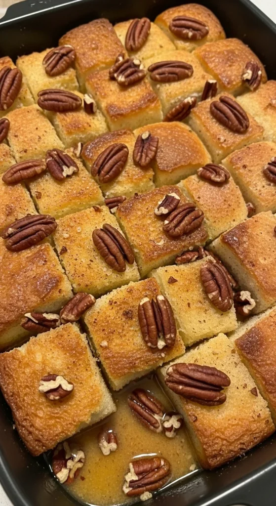 - Sprinkle pecans evenly over the soaked bread.