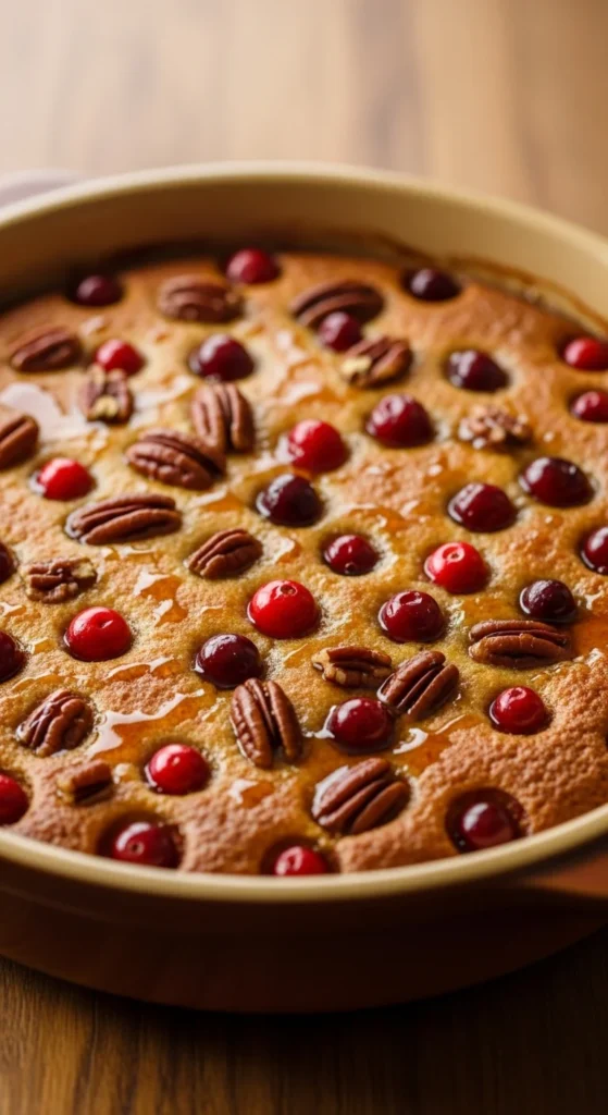 - Bake 40–50 minutes until puffed and golden, with cranberries softened.