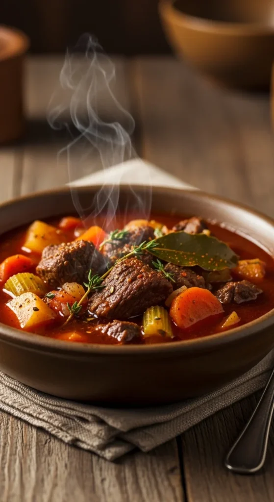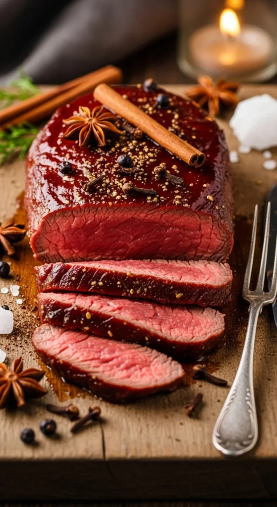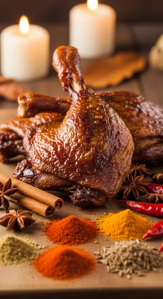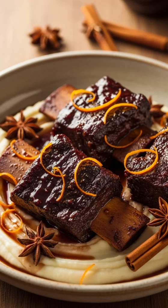 A rich, slow-cooked dish layered with winter spices and deep berry tones.