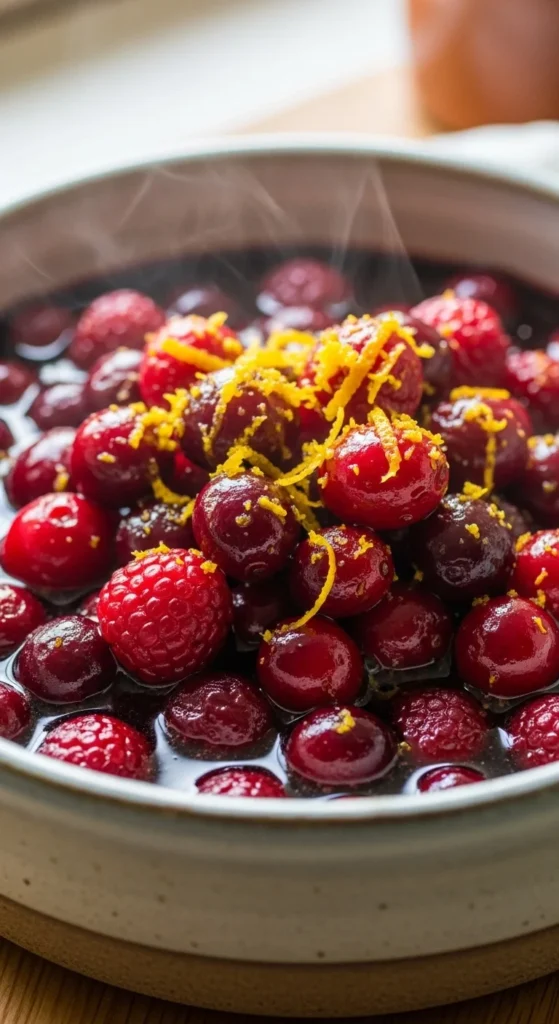 - Simmer cranberries with wine, sugar, zest, and cinnamon.