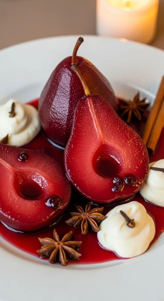 2. Mulled-Wine Poached Pears with Vanilla Cream