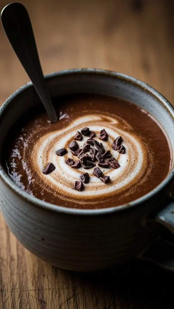 Top with cocoa nibs or a small spoon of whipped cream.