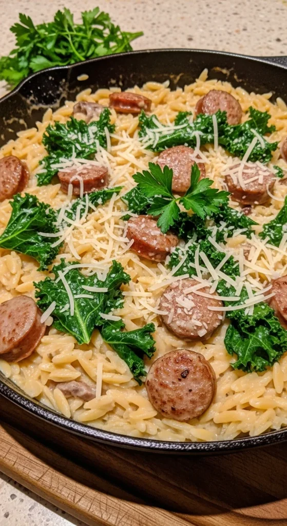 12. Creamy Sausage, Kale & Orzo Skillet