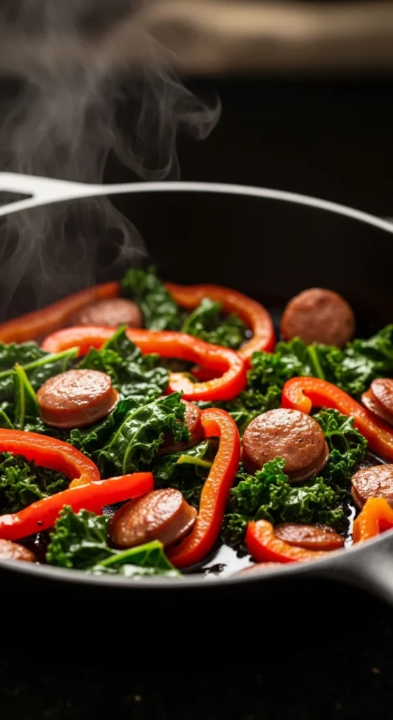 Roasted red peppers add sweetness and color, balancing the greens and sausage.