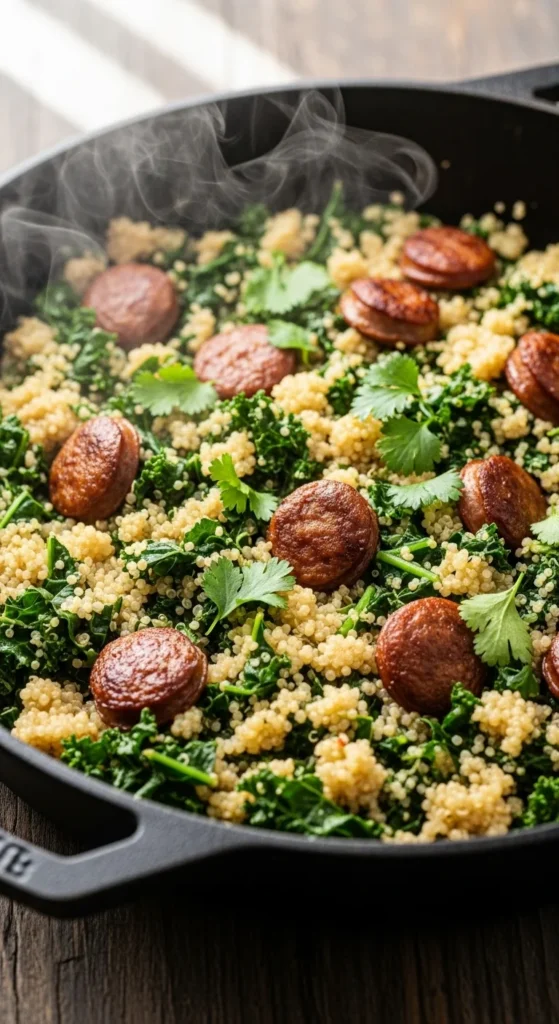 Protein-rich quinoa combines with sausage and kale for a balanced one-pan meal.