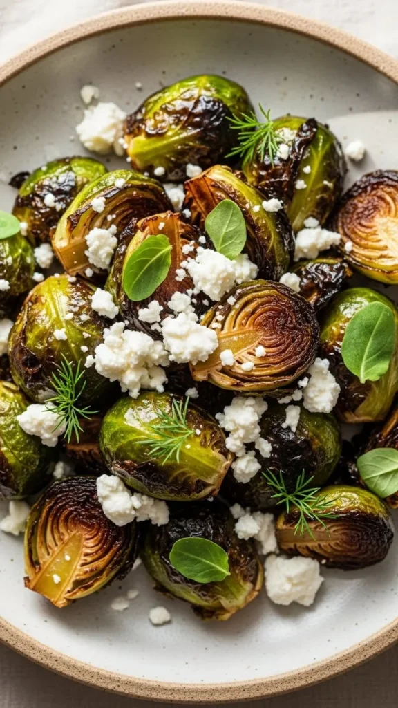 Creamy feta and fresh herbs add bright contrast to the charred, crispy sprouts.